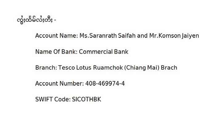 ၼၢင်းငိုၼ်းႁွမ် ၽူႈၵပ်းသၢၼ် ၵေႃႇမတီႇၵူၼ်းမိူင်းတႆးပၢႆႈၽေးလႅၼ်လိၼ်တႆး- ထႆး SSRC – TB လၢတ်ႈတီႈၽူႈတွႆႇႁွၵ်ႈဝႃႈ “တေႃႈလဵဝ်ၼႆႉ ႁဝ်းၶႃႈ လႆႈႁပ်ႉဝႆႉၶဝ်ႈသၢၼ် တီႈၽူႈမီးၼမ်ႉၸႂ်ၶဝ်ၸွႆႈမႃး 16 တၼ်ႊ(16,000 ၵီႊလူဝ်ႊ) ၼႆႉ၊ ယဝ်ႉၵေႃႈ ငိုၼ်းတီႈပိူၼ်ႈၸွႆႈထႅင်ႈ တႃႇ 3 သႅၼ်ဝၢတ်ႇပၢႆ။ ယၢမ်းလဵဝ်ၼႆႉ မုင်းမွင်းတၢင်းမိူင်းထႆးပိုတ်ႇၽၵ်းတူလႅၼ်လိၼ် ၵူၺ်းၶႃႈယဝ်ႉ၊ ႁဝ်းၶႃႈ ဢၢၼ်းဝႆႉတႄႉ တေပဵၼ်ႁူဝ်လိူၼ်ၵျူႊလၢႆႊ လိူၼ်ၼႃႈၼႆႉ တေသူင်ႇၸူးၵႂႃႇ” ဝႃႈၼႆ။