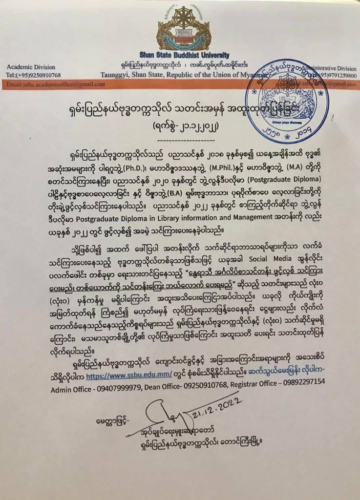 ၸၼ့်ၸွမ်ပုတ့်ထမိူင်းတႆး ၼႆ့ မီးဝႆ့တီႈ ဝဵင်းတူၼ်ႈတီး ၸိုင်ႈတႆးပွတ်းၸၢၼ်း ။ပေႃးလိူၼ် ၾႅပ်ႉပိဝ်ႊရီႊ ဝၼ်းတီႈ 7 ပီ 2023 ၼႆ့ ၸၼ့်ၸွမ်ပိုတ်ႇမႃးလႆႈၶၢဝ်းတၢင်းတဵမ် 7 ပီ။ တီႈၸၼ့်ၸွမ်ၼႆ့ ႁဵၼ်းလႆႈၸုမ်ႈၶူး Ph.D ၊ M.Phil ၊ M.A ၊ B.A ၸဵမ်ၸိူဝ်း ၼႆ့။ၸဵမ်ၵူၼ်းႁိူၼ်း မုၼ်ႈၸဝ်ႈ ၶဝ်ႈႁဵၼ်းလႆႈ ၸွမ်းၼင်ႇ ဝႃႇသၼႃႇ၊ၼမ့်ၵတ့်ၽႂ်မၼ်းမီး လိူဝ်ၼၼ့် ၵူၼ်းဢႃယုသုင် မိူၼ်ၼင်ႇ ၸရေးႁေႃးလိၵ်ႈလူင် လႄႈ ၽူႈသူင်လဵပ်ႈႁဵၼ်း လိၵ်ႈလူင်ၸိူဝ်းၼၼ့်ၵေႃႈ မီးတိုဝ့်တၢင်းၶိုၼ်ႈႁဵၼ်းဢဝ်ၸုမ်ႈၶူး B.A လႆႈ။