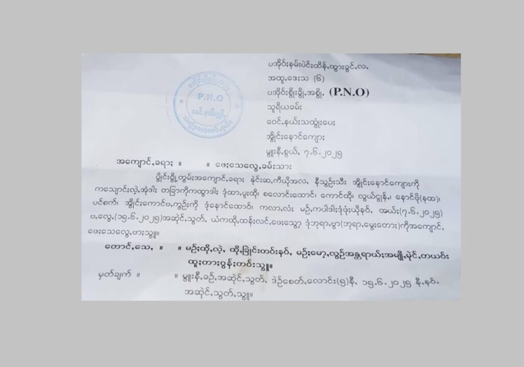 ၼႂ်းဝၼ်းတီႈ 7/6 /2025 ၾၢႆႇတၢင်းပျီတူႉၸိတ်ႉပဢူဝ်း PNO သူင်ႇလိၵ်ႈ ႁႂ်ႈၵူၼ်းဝၢၼ်ႈ တပူးထူဝ်ႇ (တပူးထို) ၊ ၵွင်ထူဝ်ႇ(ကောင်ထို) ၊ လွႆငွၼ်း(လွယ်ငွန်း) ၊ ၼွင်ဝူဝ် (နောင်ဘို) ၊ ပၢင်ႇၸၢၵ်ႈ(ပင်စက်) ဢၼ်မီးၼႂ်းဢိူင်ႇၼွင်ၵႅဝ်း လႄႈ ဝၢၼ်ႈၼွင်ထဝ် 6 ဝၢၼ်ႈ ၶၢႆႉပၢႆႈ ။ ၼႂ်းလိၵ်ႈၼၼ်ႉပႃးဝႆႉဝႃႈ တေလႆႈၶၢႆႉ ႁႂ်ႈယဝ်ႉၼႂ်းဝၼ်းတီႈ 15 လိူၼ်ၵျုၼ်ႊၼႆႉ ဝႃႈၼႆ။