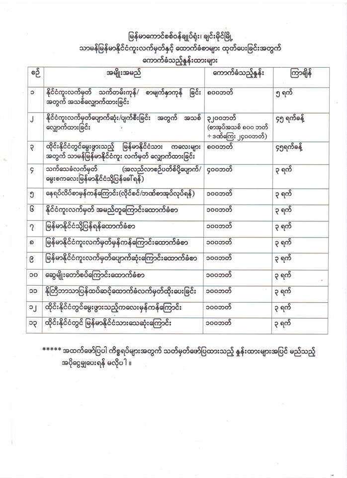ၼႂ်းပိူင်ၼၼ်ႉတႅမ်ႈဝႆႉဝႃႈ – ယွၼ်းဝႂ်ႁပ်ႉႁွင်းတီႈယူႇ တႃႇႁဵတ်းဝႂ်ၶပ်းၶီႇ၊ သိုဝ်ႉလူတ်ႉ၊ ဢူၼ်းလူတ်ႉ သဵင်ႈငိုၼ်း 100 ၿၢတ်ႇ ၸႂ်ႉၶၢဝ်းယၢမ်း 3 ဝၼ်း။ ယွၼ်းဝႂ်ႁပ်ႉႁွင်း Passport ႁၢႆ သဵင်ႈငိုၼ်း 100 ၿၢတ်ႇ ၸႂ်ႉၶၢဝ်းယၢမ်း 3 ဝၼ်း။ ယွၼ်းဝႂ်ႁပ်ႉႁွင်းပဵၼ်ပေႃႈမႄႈလုၵ်ႈၵၼ်ပီႈၼွင်ႉၵၼ် သဵင်ႈငိုၼ်း 100 ၿၢတ်ႇ ၸႂ်ႉၶၢဝ်းယၢမ်း 3 ဝၼ်း။ ယွၼ်းဝႂ်ႁပ်ႉ ႁွင်ႈၵၢၼ်ၵိူတ်ႇ လုၵ်ႈဢွၼ်ႇဢၼ်ၵိူတ်ႇ ၼႂ်းမိူင်းထႆး သဵင်ႈငိုၼ်း 100 ၿၢတ်ႇ ၸႂ်ႉၶၢဝ်းယၢမ်း 3 ဝၼ်း။ ယွၼ်းဝႂ်ႁပ်ႉ ႁွင်းၵၢၼ်တၢႆ သဵင်ႈငိုၼ်း 100 ၿၢတ်ႇ ၸႂ်ႉၶၢဝ်းယၢမ်း 3 ဝၼ်း။ Passport ႁၢႆသေယွၼ်းႁဵတ်းမႂ်ႇ သဵင်ႈငိုၼ်း 3,200 ၿၢတ်ႇ ၸႂ်ႉၶၢဝ်းယၢမ်း 45 ဝၼ်း။