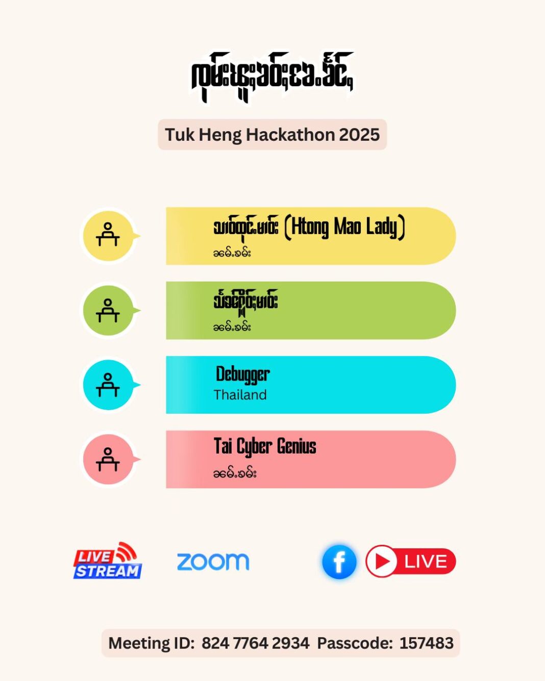 ၽူႈလူင်ႉလႅၼ်ႇၾၢႆႇဢၢႆႊထီႊ ၵူၼ်းၼုမ်ႇတႆးဢၼ်ၶဝ်ႈႁူမ်ႈတူင်ႉၼိုင်ၵေႃႉၼိုင်ႈလၢတ်ႈၽူႈတွႆႇႁွၵ်ႈဝႃႈ- “ဢၼ်မႃး Present ၶဝ်ႈၶႄႉၶႅင်ႇ မီး 4 ၸုမ်း 1- ၸုမ်း သၢဝ်ထုင်ႉမၢဝ်း (ဝဵင်းၼမ်ႉၶမ်း)၊ 2- ၸုမ်း သႅၼ်ႁိူဝ်ႈမၢဝ်း (ဝဵင်းၼမ်ႉၶမ်း)၊ 3- ၸုမ်း Debugger (Thailand)၊ 4- ၸုမ်း Tai Cyber Genius (ဝဵင်းၼမ်ႉၶမ်း)။ ၽႂ်လႆႈသူးထီႉၼိုင်ႈ တေမီးငိုၼ်းသူး 1000000 MMK ($250) ၊ သူးထီႉသွင်ႇပဵၼ် 200000 MMK ($50) ၊ ၵူၼ်း Sponsors တႄႉပဵၼ် Tai Hleng Shan Youth Association ၵူၼ်းၼုမ်ႇတႆးလႅင်း၊ Awaken Technology Innovative Lab လႄႈ Sao Kyaw Zeya (ၸဝ်ႈၵျေႃႇၸေႇယ) Alumni of the Asian Institute of Technology” ဝႃႈၼႆ ။
