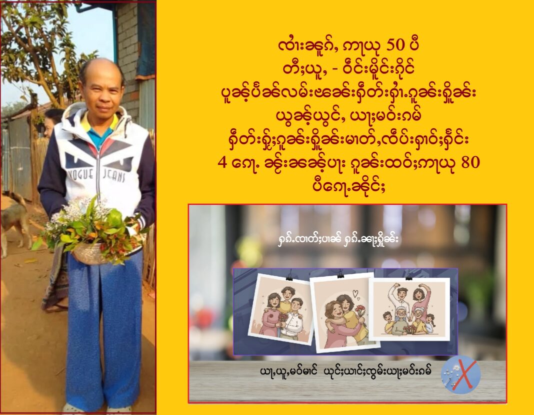 ၼႂ်းဝၼ်းတီႈ 1/8/2025 ယၢမ်းႁူဝ်ၶမ်ႈ 6 မူင်း ၸၢႆးၼူၵ်ႇ ဢႃယု 50 ပီ(ပဵၼ်ၼွင်ႉၶူၺ်) ၶဝ်ႈၽၼ်း ပီႈဢၢႆႈပီႈၼၢင်းမေး လႄႈ မႄႈၸဝ်ႈ 4 ၵေႃႉ ႁဵတ်းႁႂ်ႈ မၢတ်ႇၸဵပ်းႁၢဝ်ႈႁႅင်းလႆႈသူင်ႇယူတ်းယႃႇတူဝ်ဝႆႉထိုင်ဝၼ်းမိူဝ်ႈၼႆႉ ။