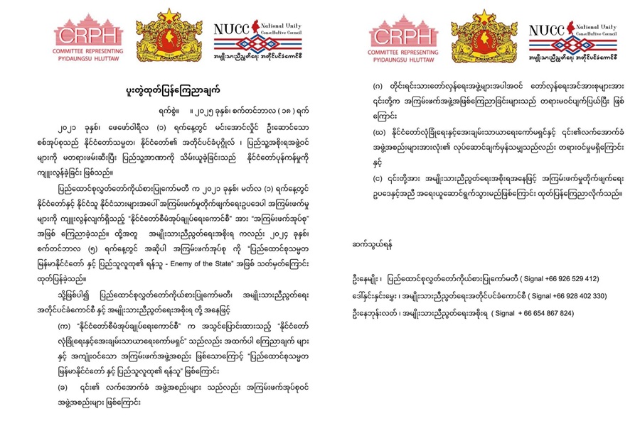 ၼႂ်းလိၵ်ႈပိုၼ်ၽၢဝ်ႇၼၼ်ႉ ၸႅင်ႈပႃးဝႆႉဝႃႈ တေဢဝ်လိူင်ႈၸုမ်းသိုၵ်းမၢၼ်ႈ တင်း ၸုမ်းၸိူဝ်း ႁပ်ႉထွမ်ႇၶေႃႈသင်ႇသိုၵ်းမၢၼ်ႈၵႂႃႇ – ၸွင်းၼင်ႇပၵ်းပိူင်ဝၢၼ်ႈမိူင်း ဢၼ်လူင်ပွင်ၸိုင်ႈၽွမ်ႉႁူမ်ႈၸိူဝ်ႉၸၢတ်ႈႁဵတ်းဢွၵ်ႇဝႆႉၼၼ်ႉၼႆ ၸုမ်း CRPH ၊NUCC ၊ NUG ပိုၼ်ၽၢဝ်ႇဝႆႉၼင်ႇၼႆ။