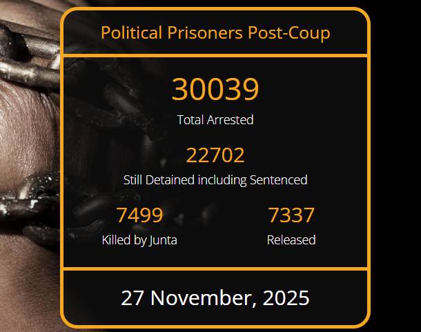 27/11/2025 ၼႆႉ ယူႇတီႈၸုမ်းလူလွမ်ၵူၼ်းတူၵ်းၶွၵ်ႈၼႂ်းမိူင်းမၢၼ်ႈ AAPP ပိုၼ်ၽၢဝ်ႇဝႆႉတႄႉ ၼႂ်းမိူင်းႁူမ်ႈတုမ်မၢၼ်ႈၼႆႉ ၵူၼ်းတူၵ်းၶွၵ်ႈဢၼ်ၵဵဝ်ႇၶွင်ႈၵၢၼ်မိူင်း မီး 22702 ၵေႃႉ ။ ၼႆႉ ပဵၼ်ၶေႃႈမုလ်းယိုၼ်းထိုင်လႆႈၵူၺ်း ဢၼ်ဢမ်ႇႁူႉၸွမ်းၵေႃႈ မီးထႅင်ႈလူးၵွၼ်ႇ ဝႃႈၼႆ။