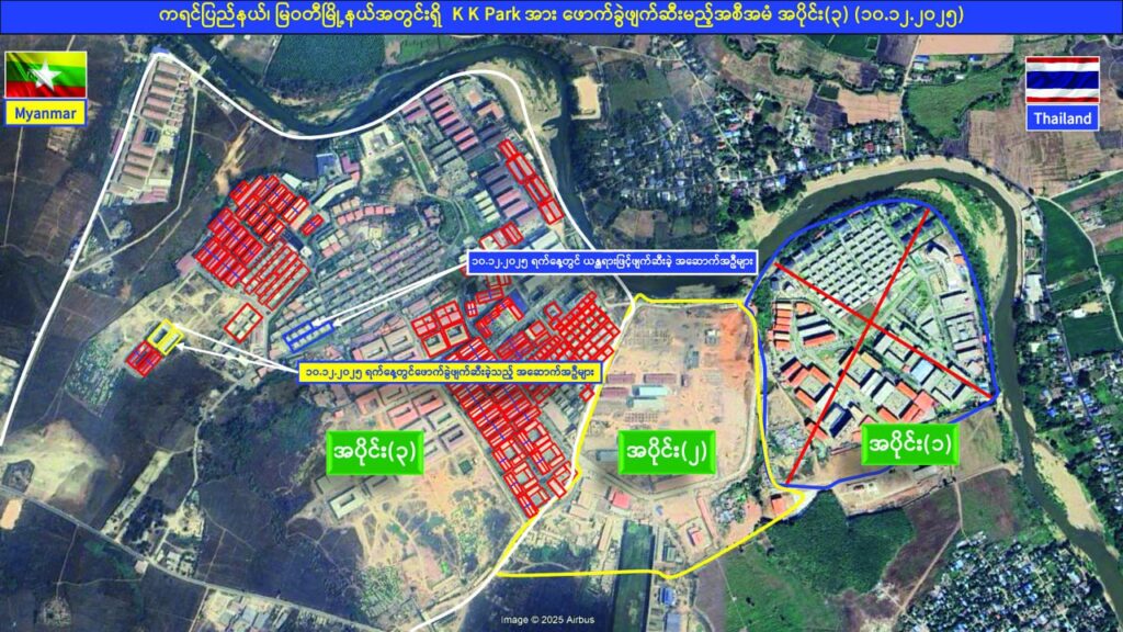 ၼႂ်းၼၼ်ႉ ၶဝ်ႈပႃးဝႆႉဢွင်ႈတီႈၸိုဝ်ႈလိုဝ်းလင် မိူၼ်ၼင်ႇ KK Park၊ သူၺ်ႇၵူၵ်ႉၵူဝ်ႇ လႄႈ ၵျွၵ်ႉၶတ်ႉ။ ဢိင်ၼိူဝ်ၸုမ်းပၵ်းတႃပႂ်ႉတူၺ်း ဢွင်ႈတီႈၸုမ်းၵျႃႊၽျႅၼ်ႉတူင်ႉၼိုင် Cyber Scam Monitor လႄႈ Justice for Myanmar (JFM) ၶဝ် ၵဵပ်းၶေႃႈမုလ်းပိုၼ်ၽၢဝ်ႇဝႆႉၼၼ်ႉသေ သိုဝ်ႇ Myanmar Now ၶိုၼ်းႁၢႆးငၢၼ်းဝႆႉဝႃႈ ဢွင်ႈတီႈၸုမ်းၵျႃႊၽျႅၼ်ႉတူင်ႉၼိုင်တီႈလႅၼ်လိၼ် မီးဝႆႉ 42 တီႈ။ ႁူင်းတိုၵ်းၸိူဝ်းၼၼ်ႉ မီးဝႆႉတီႈၾင်ႇမႄႈၼမ်ႉသွင်ယၢင်း (သောင်ရင်းမြစ်) တႄႇတီႈဝဵင်းမႂ်ႇ သူၺ်ႇၵူၵ်ႉၵူဝ်ႇ ၾၢႆႇႁွင်ႇဝဵင်းမျႃႉဝတီႇ တေႃႇပေႃးထိုင် ဝဵင်း ဝေႃးလေႇမျႅင်ႇ (ဝေါ်လေမြိုင်) ၾၢႆႇၸၢၼ်းဝဵင်း မျႃႉဝတီႇ။