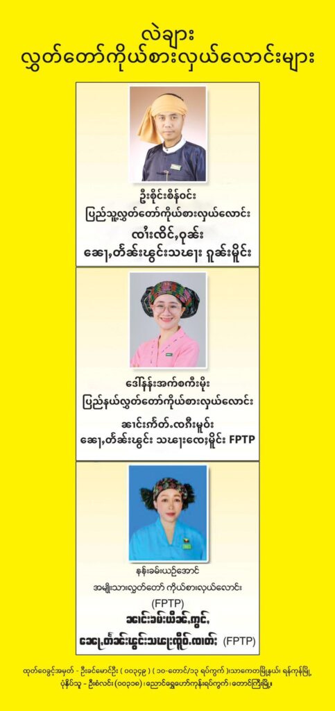 ၼႂ်းၸႄႈဝဵင်းလၢႆးၶႃႈၼႆႉ ပႃႇတီႇသိူဝ်ၽိူၵ်ႇ (SNDP) ၊ ပႃႇတီႇသၢင်ႇသီႈ (USDP)၊ ပႃႇတီႇ တ သ ၺ ၶဝ်ႈၶႅင်ႇၵၼ် တီႈၼင်ႈသၽႃးၵူၼ်းမိူင်း၊ သၽႃးၸႄႈမိူင်း လႄႈ သၽႃးၸိူဝ်ႉၸၢတ်ႈ ။