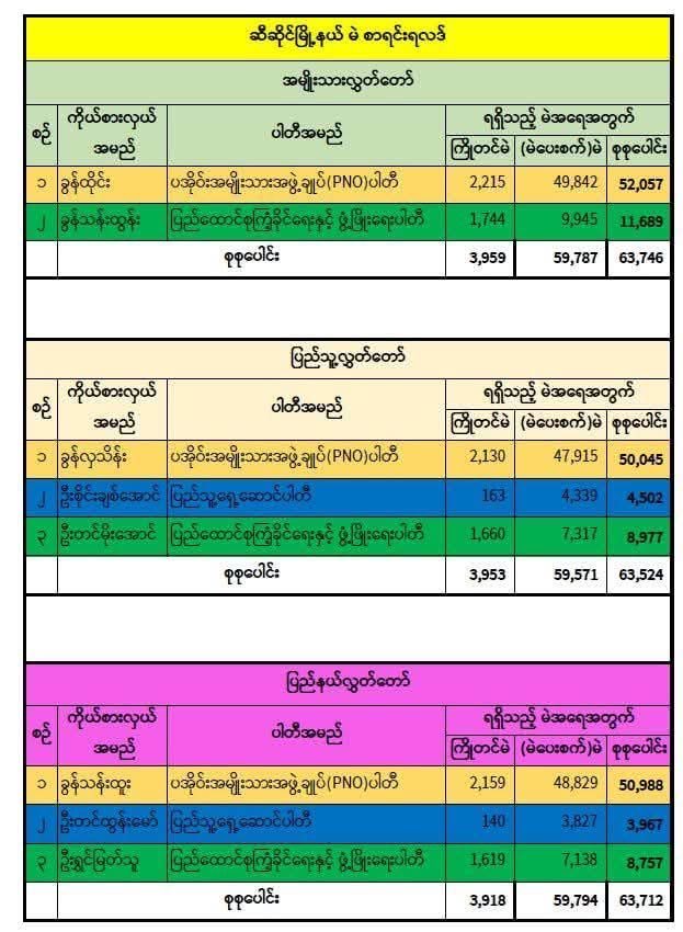 ၼႂ်းၸႄႈဝဵင်းသီႇသႅင်ႇၼႆႉ ၼေႃႇတႅၼ်းၽွင်းပႃႇတီႇ ပဢူဝ်း PNO တႅၼ်းၽွင်းၸိူဝ်ႉၸၢတ်ႈ ပဵၼ် ၶုၼ်ႇထႆး လႆႈၶႅပ်းၵၢင်ၸႂ် 52057 ၶႅပ်း ၼေႃႇတႅၼ်းၽွင်းသၽႃးၵူၼ်းမိူင်း ၶုၼ်ႇလႃႉတဵင်း တင်းၶႅပ်းမႄး 50045 ၶႅပ်း လႄႈ ၼေႃႇတႅၼ်းၽွင်းသၽႃးမိူင်းတႆး (FPTP ) ၶုၼ်ႇသၢၼ်းထူး 50988 ၶႅပ်း သေဢွင်ႇပေႉပႃႇတီႇ PPP တင်း USDP ၵႂႃႇဝႃႈၼႆ ။